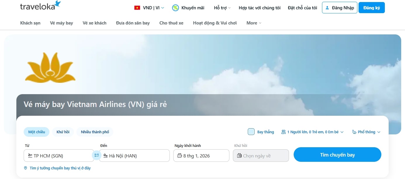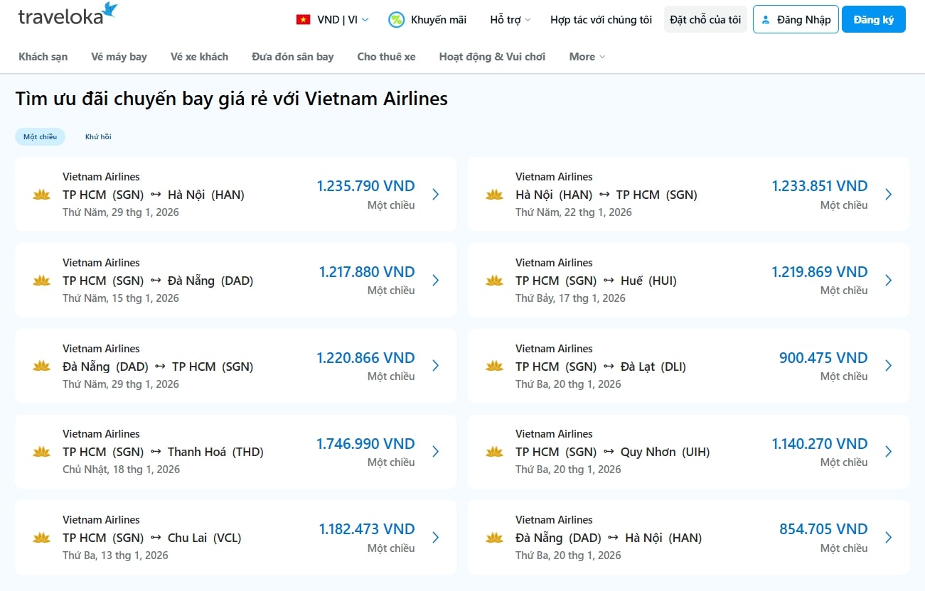 Với mạng đường bay rộng, dịch vụ ổn định và nhiều khung giờ linh hoạt, Vietnam Airlines sở hữu nhiều chặng bay nổi bật đáp ứng tốt cả nhu cầu công tác lẫn du lịch. Từ các trục bay nội địa sôi động đến những đường bay quốc tế dài ngày, hãng luôn là lựa chọn đáng tin cậy của nhiều hành khách. Để tối ưu chi phí và dễ dàng lựa chọn chuyến bay phù hợp, việc theo dõi và đặt vé thông qua Traveloka sẽ giúp bạn tiết kiệm thời gian, chủ động ngân sách và có hành trình suôn sẻ hơn ngay từ khâu chuẩn bị.